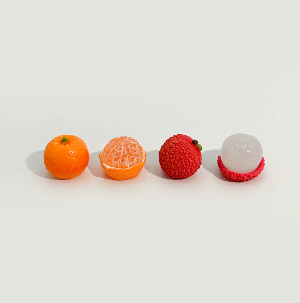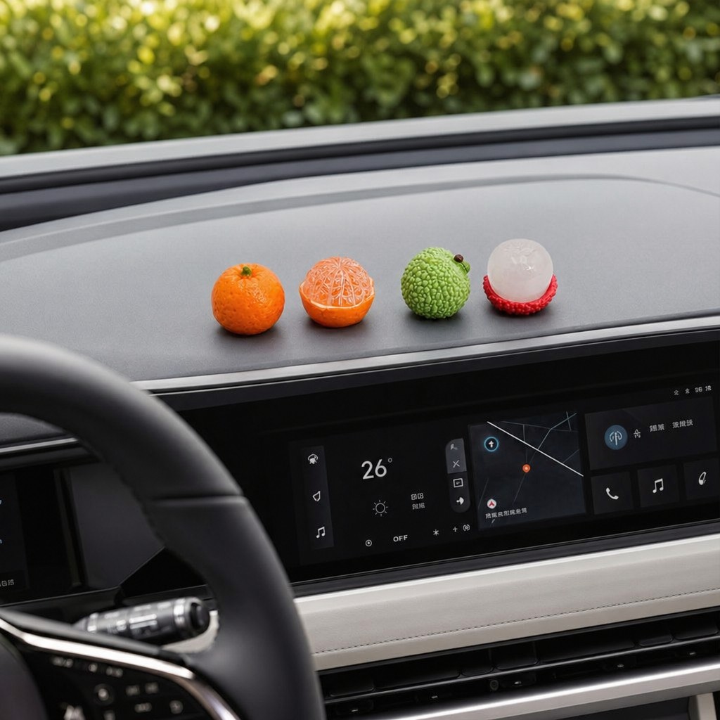 指令:把附件图从左往右的第3个水果换成绿色,然后把图片贴在汽车的中控台上,实现一张汽车内饰小物件搭配效果图