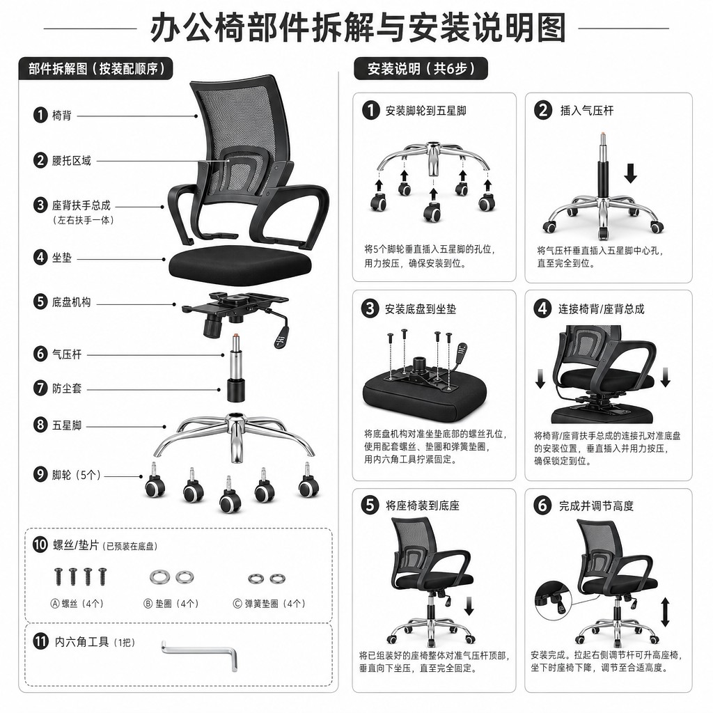 指令:根据附件实拍场景,生成一份带编号部件与分步安装的「办公椅拆装说明」板式长图