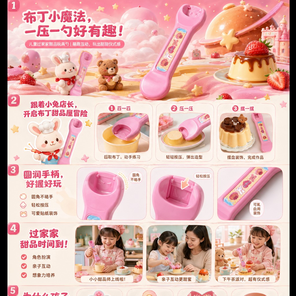 指令:附件是一个儿童玩具布丁勺子,请设计一套趣味故事性的电商详情图